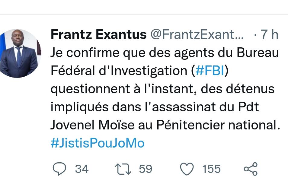 Des détenus incarcérés au Pénitencier National ont été auditionné par les enquêteurs du Bureau Fédéral d’Investigation (FBI), ce mardi 8 février 2022. L’information a été donné sur le compte tweeter de l’ancien Secrétaire d’État à la communication, Frantz Exantus.