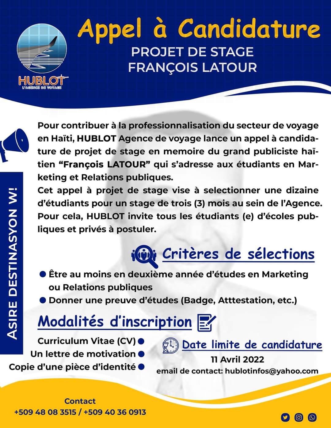 Le projet de stage François Latour organise en mémoire de ce célèbre publiciste haïtien est inscrit dans le cadre de contribution de Hublot à la professionnalisation du secteur du voyage en Haïti. De par cette initiative, l’administration de cette agence compte offrir un stage de trois(3) mois aux dix candidats qui seront sélectionnés.